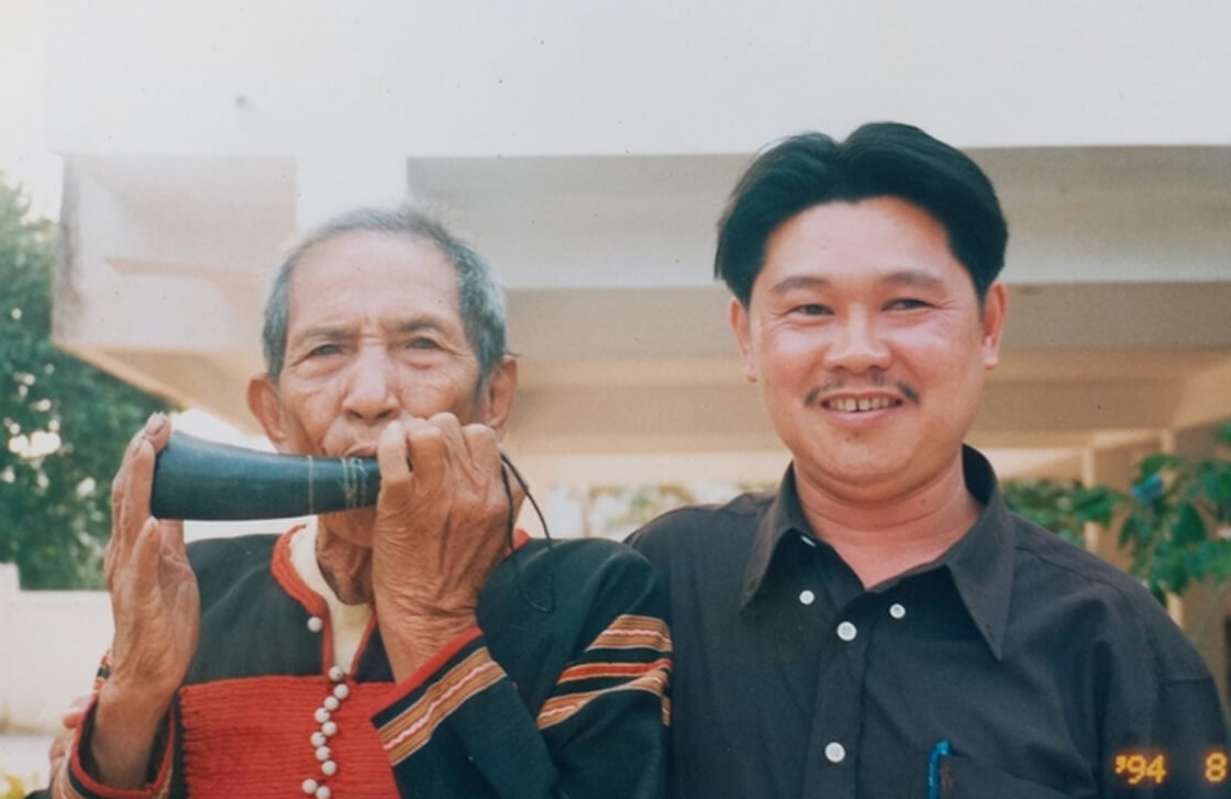 Vua voi Tây Nguyên Đàng Năng Long bên cạnh huyền thoại Tây Nguyên A Ma Kong vào tháng 8/1994. Ảnh: Trương Nhất Vương.